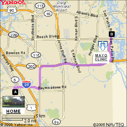 Mayo Clinic is 15 miles... 22 minutes away. Several ways to get there: · Baymeadows to I-95 North to JTB 202 East · I-95 South to the new 9A, to JTB 202 East · Baymeadows Road east to 9A to JTB 202 East (there are other street routes)